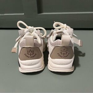 Unisex trendy toddler sneakers in white, beige and gray, perfect for everyday adventures. Comfortable and durable. Worn twice. Still in great condition. Size 5.5. Great for baby/toddler.