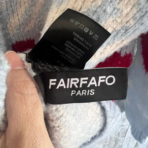 Very good, lightly worn condition. Some light piling from wear. So cute to fit oversized and relaxed. Crewneck cardigan with all around larger accents features. Rolled sleeve style. Fabric content is not available. But believe a nylon and polyester combination with a small amount of wool.
