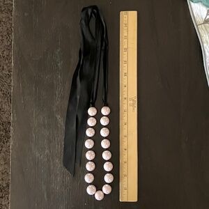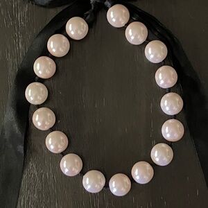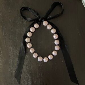 Pale Pink Faux Pearl Necklace Black Ribbon Tie.