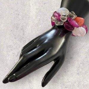 Chunky Pink White Clear Orange and Silver 3 Strand Stretch Statement Bracelet