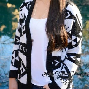 Chunky white and black tribal printed cardigan with five black buttons along the right side. 100% Acrylic.