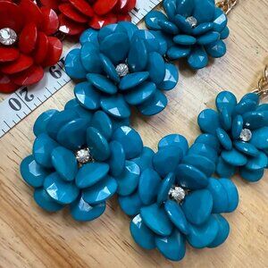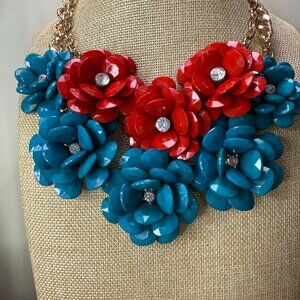 Chunky Red & Blue Floral Statement Necklace With Gold-Tone Chain And Crystal
