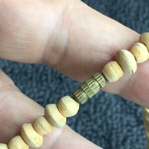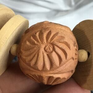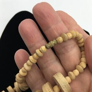 Chunky Red (Terra Cotta) & Black Clay & Wooden Disc Bead Necklace. One Red (Light orange in color) clay bead & 2 black clay beads with wooden disk and round natural-colored beads. One of the larger wooden beads has slight discoloring that is visible in a couple of the photos. Barrel style clasp. Preowned excellent condition. Approximately 22" long. Not branded. Dime shown for size reference only and is not included in the listing.