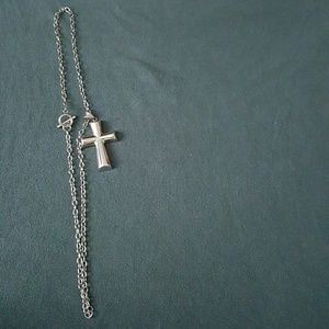 Lightweight chunky Silver Cross comes with a long chain. Opening in chain is large enough to fit over your heads. Cross comes down to about bust height and pairs easily with many different outfits.