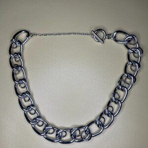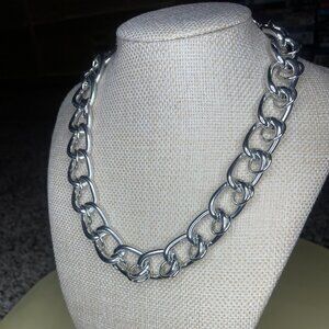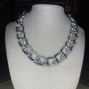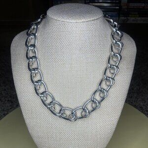 A chunky silver-tone link chain necklace that embodies the latest trend in statement jewelry. This collar-length necklace features large, interconnected oval links with a highly polished finish, creating a sleek and substantial look. It's designed to be a centerpiece accessory, worn alone or layered with more delicate chains for an edgy, on-trend style.