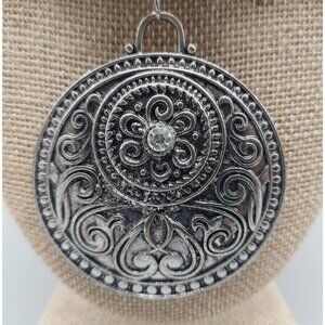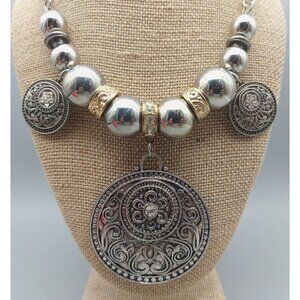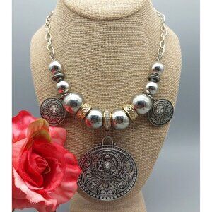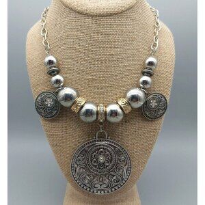 Chunky Silver Tone Beaded Statement Large Pendant Necklace Rhinestone Accents 18