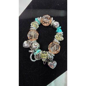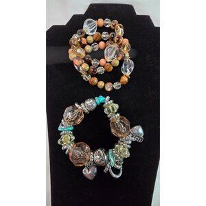 Chunky Silver Tone Glass & Turquoise Colored Chip Stretch Bracelet Bundle Boho
