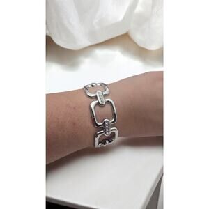Chunky Silver Tone Link Hinged Bracelet with Rhinestone Accents