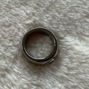 wide silver band statementring with crystalrhinestone jewel in the middle, silver toned metal with cubic zirconia gem, bold fashion jewelry