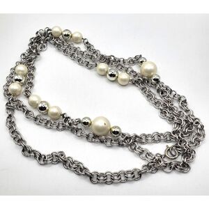 Chunky Silver tone Immitation Pearl Long Strand Sturdy Necklace 54inMaterials: silver tone metal alloy, faux pearl Length: 54in Clasp: lobster Signed? no Excellent vintage condition