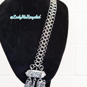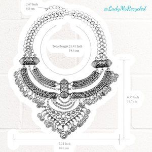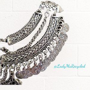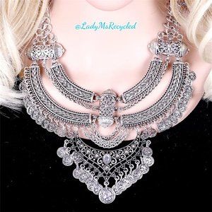 This chunky boho bib coin necklace will definitely get noticed! Silver-tone alloy is of medium weight and comfortable to wear. Perfect for festivals, belly dancing gear, or with a sexy tank top. The earrings match the little "coins" on the necklace. Cute!