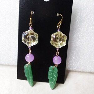 This is a substantial pair of long danglers - just under 3" and of a medium to heavier weight range, due to the big and chunky floral glass beads. All bead components are various types of glass beads - heavily embossed, handmade rose flower blossoms in a translucent glass with a yellow AB finish [shimmer + glimmer] + tiny seed beads + a lovely lilac bead in the middle and a pressed glass leaf at the bottom of this ensemble. Simple brass earwires.