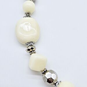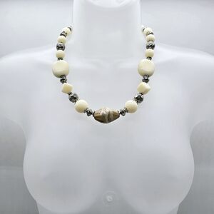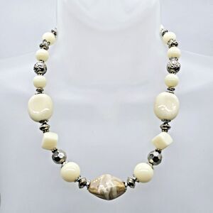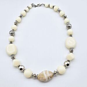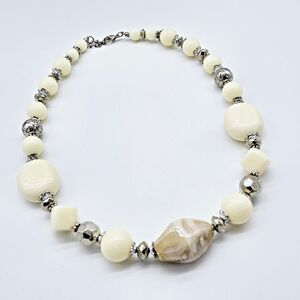 Chunky Statement Necklace Glass Ivory Tone Marbled Silver Accent Rose Bead Facet. Necklace is 18" adjustable to 20". The smaller ivory beads are acrylic, the larger are glass. Range is 9mm to 33mm. Silver beads are faceted and rose shaped. Perfect for summer. In good pre-owned condition.