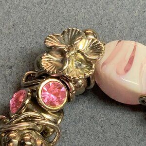 Who knew a bracelet could be a party all on its own? This silver-tone stretchy gem combines marbled pink and white beads, glittery rhinestones, and blooming flowers in playful harmony!