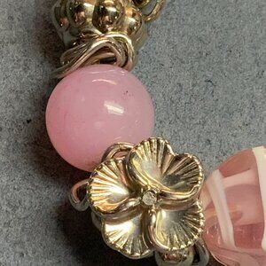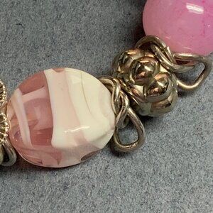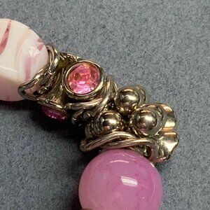Chunky Stretch Bracelet 7 In Pink White Marbled Beads Silver Flowers Bling Glam