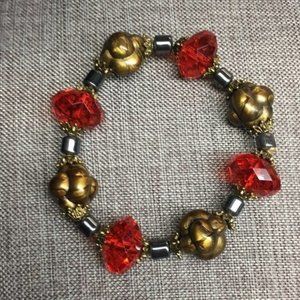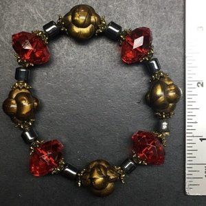 Chunky stretch bracelet with goldtone organic, gunmetal silver tone and faceted red translucent beads! #RedBracelet #ChunkyRedBracelet #GunmetalBracelet #ChunkyBracelet #GoldBracelet #OrganicBracelet #StretchBracelet #RedStretchBracelet #GunmetalSilverBracelet