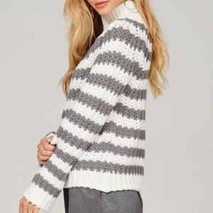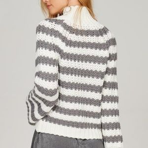 This chunky mock turtleneck sweater with striped pattern and bell sleeves in dove white/grey.