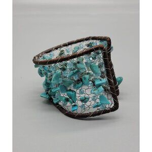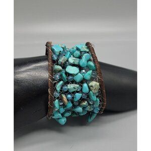 Chunky Turquoise Open Cuff Bracelet Wire Stitched Stones Handcrafted Size 7.5"