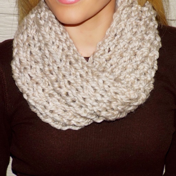 Handmade, one of a kind infinity scarf knit by myself. This color reminds me of a vanilla latte! Chunky, but not bulky! You'll love this for the next coming colder months 😘👌🏻❄️