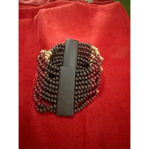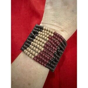Make a bold, earthy statement with this chunky wood bead bracelet. Featuring rich tones of dark brown, burgundy, and tan, this piece brings a natural yet stylish vibe to your outfit. The multi-strand design is strung on stretchy cord with a secure wood bar backing, making it easy to slip on and off. Perfect for boho, tribal, or artisan-inspired looks.