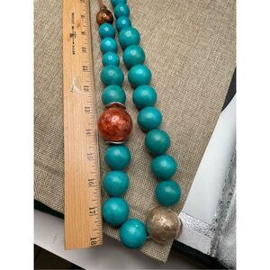 Chunky Wood Beaded Necklace Graduated Beads Turquoise Color with a some mixed beads on Leather Strap. Pull Over Style.