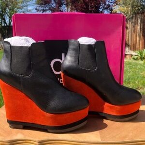 Chunky platform booths. Orange suede and black leather upper by Dolce Vita