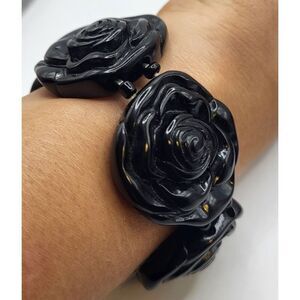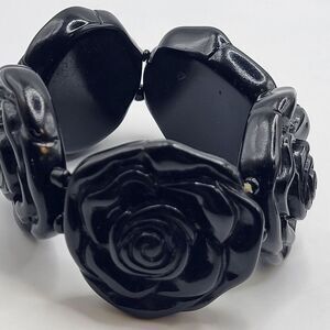 Chunky Black Bakelite Rose Bracelet 7in | Materials: bakelite | Length: 7in | Clasp: stretchy | Signed? no | Excellent vintage condition