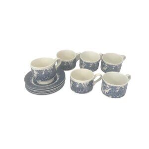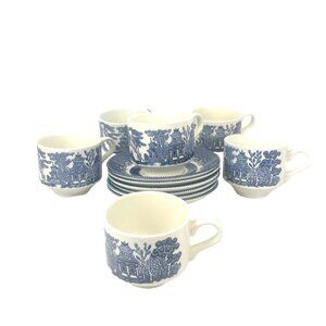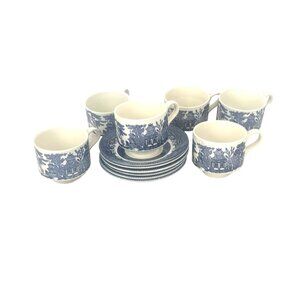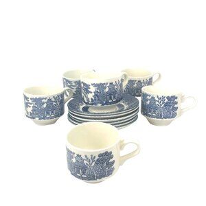 This exquisite set of six vintage cups and saucers features the iconic blue and white Willow pattern, meticulously crafted from durable ironstone china. Each cup showcases a serene landscape design, adding a touch of timeless elegance to your tea or coffee experience. Ideal for collectors or those who appreciate classic tableware.