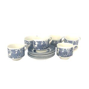 Churchill Ironstone Vintage Blue & White Willow Pattern Cups With Saucers Set Of
