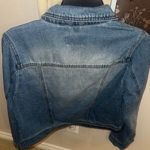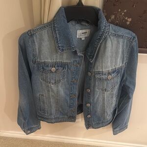Light blue denim jacket with button closure. Features front pockets and a classic collar.