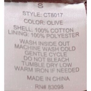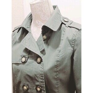 This is a Ci Sono Oliver Green Lightweight Double-Breasted Jacket in size Small. It is made of cotton twill with a solid green color. The jacket has long sleeves, a short length, and a button closure. It features military-inspired accents like buttons and a buckle, suitable for travel, casual wear, workwear, or business attire. The lining is made of acetate, and it is a classic fit style for women, perfect for summer, fall, and spring seasons.