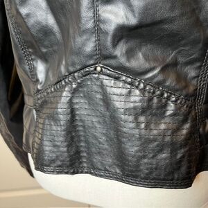 Ci Sono by Cavalini Faux Leather BIkerJacket Ladies Black. Lots of details, zippers, tucks and stitching! See photos for details and measurements. This Jacket needs repaired in one armpit where seam is coming unsewn as shown in last photo. Fabric is not damaged.