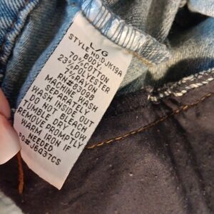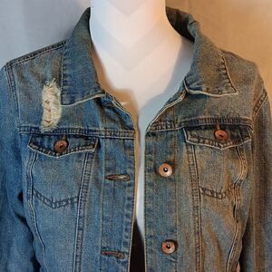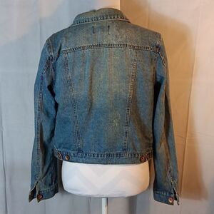 Stylish and versatile blue denim jacket perfect for any casual outing. Size Large with a pit to pit measuring 20" and a length of 20". Features a classic design with button closures and a comfortable fit.
