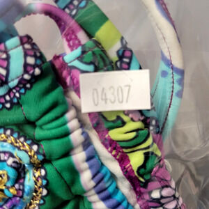 Features multicolor stripes in purple, green, blue, yellow, pink with floral and paisley accent details
