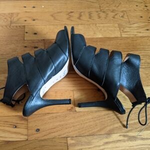 Black leather heels with peekaboo slits, peep toe, and adjustable laces at ankle.