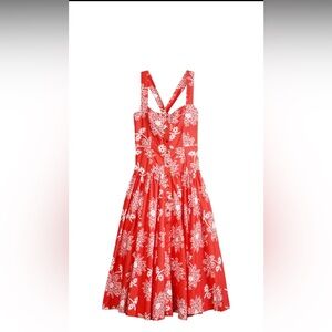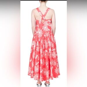 Beautiful "Hoku" dress in a white and coral floral print ("Paradise"). The pictures don't do it justice - think 1950s La Dolce Vita! Please note that the coral color is lighter in person (like a medium coral red pink) - it is not red or a bright coral red and is closer to the picture 1 & 3 (stock pictures). Also, pictures were taken with the straps uncrossed to show the design better.