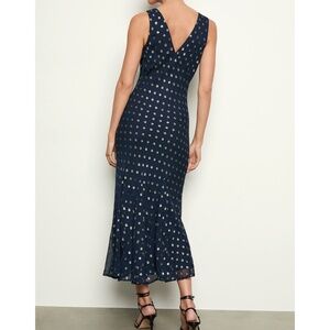 Done in navy georgette flecked with gold polka dots, this slip dress looks like wearable tinsel. Notjustfun, it’s ultraflattering, too—cut on the bias so it falls nicely, and finished with feminine details like a V-neck and back, angled seams at the bust, and a flippy godet hem that flutters with movement.