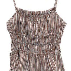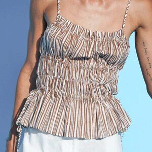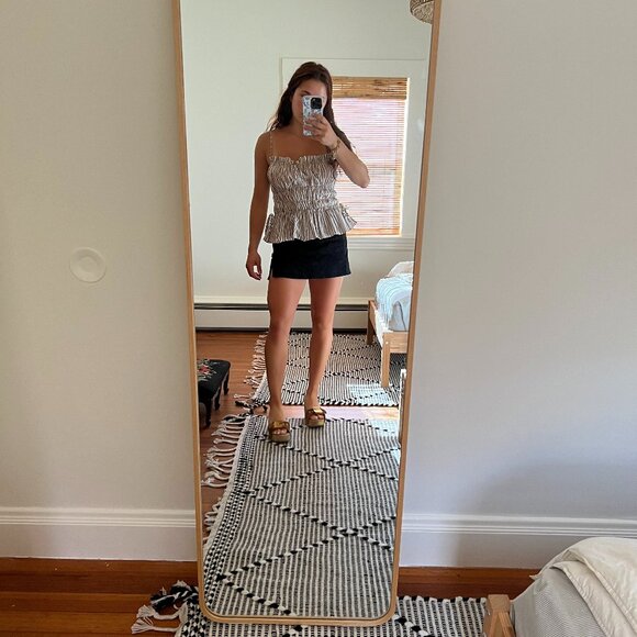 Such a fun top! The way the bodice is scrunched around the waist is so flattering and then the pop at the hips adds a fun touch!