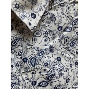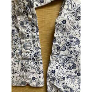 Toddler boys dressy button front shirt with a stiff collar. Worn once by my son for a wedding with a bright blue bow tie. The paisley print is detailed and stunning navy/white combo. Fabric feels luxurious!