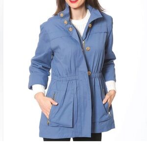 Stay stylish and comfortable with this elegant blue jacket. Perfect for any occasion, it offers both fashion and functionality. Hidden hoodie , zipper and button closure, roll up sleeve and zipper pockets. Excellent condition and smoke free home.