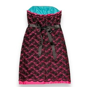 Magenta strapless midi-length dress overlaid with scalloped black floral Aleçon style lace. Comes with a removable satiny black ribbon waist tie. Bust has light boning.