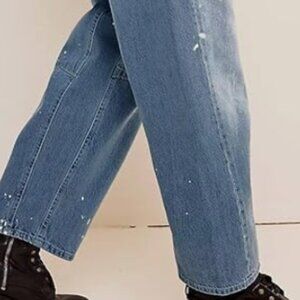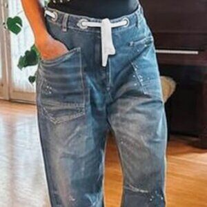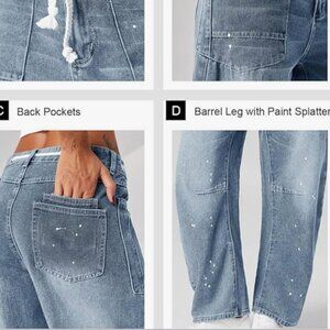 Barrel wide leg, tapered silhouette, oversized patch pockets, contrast drawstring waist and unique paint splatter features that adds a touch of charm retro to your outfit.