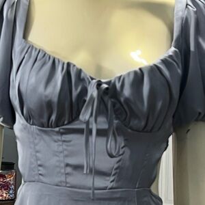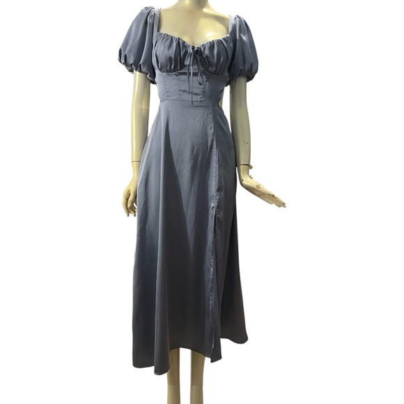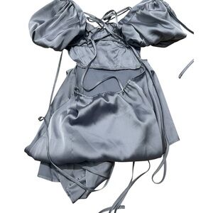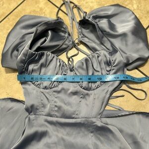 Light Blue Cut Out Satin Dress With Side Zip And Cris Cross Lace On Back with front slit