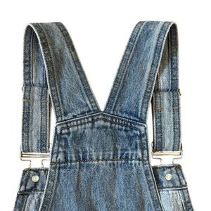 Cider Jeans Bib Shorterall Romper. Blue Denim with medium wash. Silver Hardware. Deep front pockets. Raw Rolled Hem. No fabric tag but cotton with a little stretch. Lightweight.