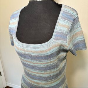 Chic knit dress with blue and gray stripes. Features a square neckline and short sleeves. nwot