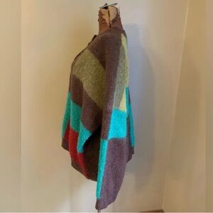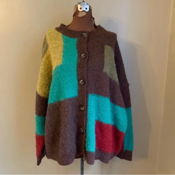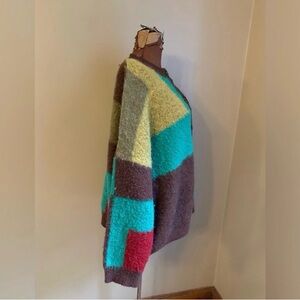 Ultra cozy cardigan with bold color blocks. Features brown, teal, red, and yellow. Size XL. Acrylic nylon wool blend. Good condition. Preloved but good condition.