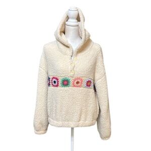 Cozy cream fleece hoodie. Features colorful crochet accents. Perfect for casual wear.