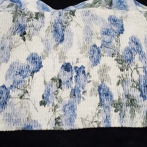 Elegant women's top featuring a beautiful blue floral pattern on a white background. Perfect for adding a touch of sophistication to any outfit.