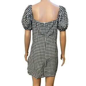 Lightweight gingham mini dress. Puff sleeve. Woven cotton. Straight with a little flare at the hem.