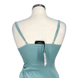 This ruched aqua midi dress features a fitted silhouette, spaghetti straps, and a sweetheart neckline. Its elegant design is ideal for formal or semi-formal settings.